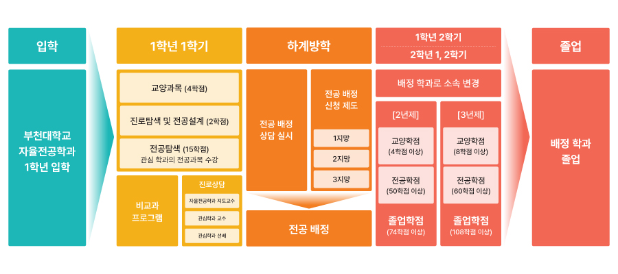 3. 전공배정 후 1학년 1학기 전공필수 과목을 미이수할 경우, 졸업학점 부족 또는 국가자격증 응시요건 미충족으로 인해 졸업이 유예될 수 있습니다.