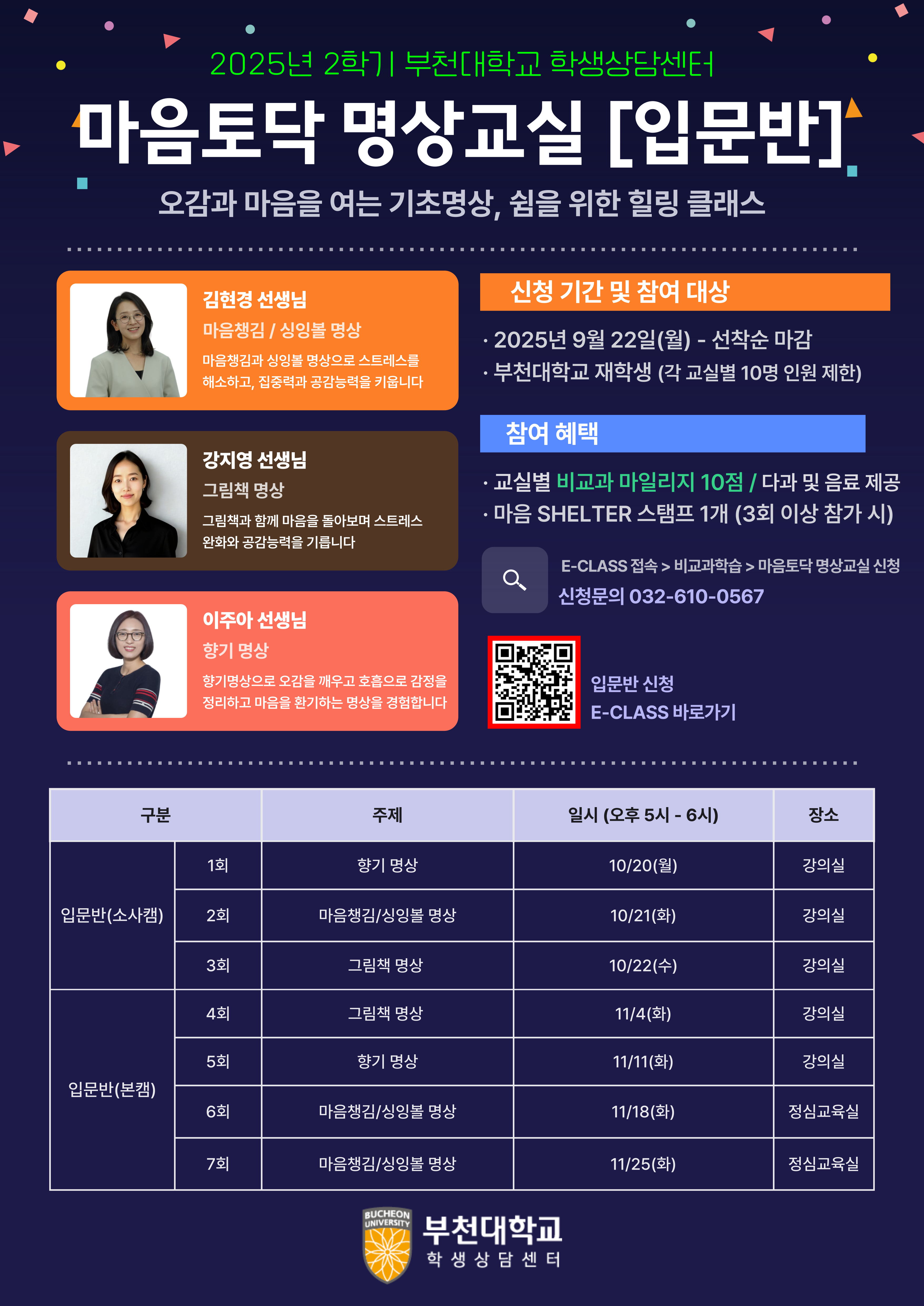 * 명상교실이란? 소그룹으로 명상 전문가와 함께 모여 보다 깊이 있게 명상을 체험하는 힐링 클래스입니다! * <소사캠퍼스 신청하러 가기> 원하는 일정을 클릭해주세요! 2) 10월 21일 화요일 오후 5-6시 마음챙김/싱잉볼명상 * <본캠퍼스 신청하러 가기> 원하는 일정을 클릭해주세요! 3) 11월 18일 화요일 오후 5-6시 마음챙깅/싱잉볼 명상 4) 11월 25일 화요일 오후 5-6시 마음챙김/싱잉볼 명상