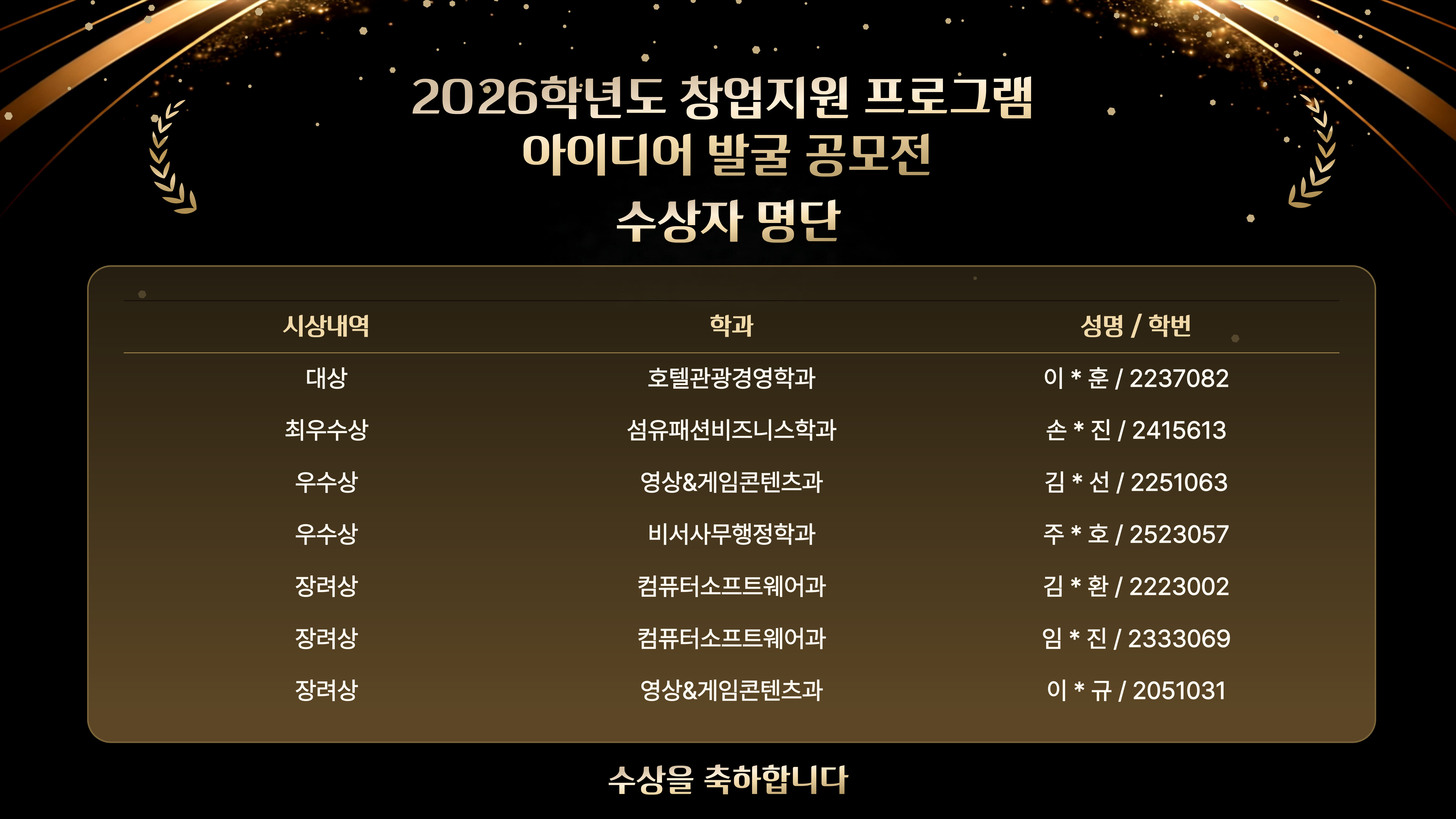 2026학년도 창업지원 프로그램 아이디어 발굴 공모전 수상자를 발표합니다. 본 공모전에 참여해주신 모든 학생여러분들께 감사드립니다.