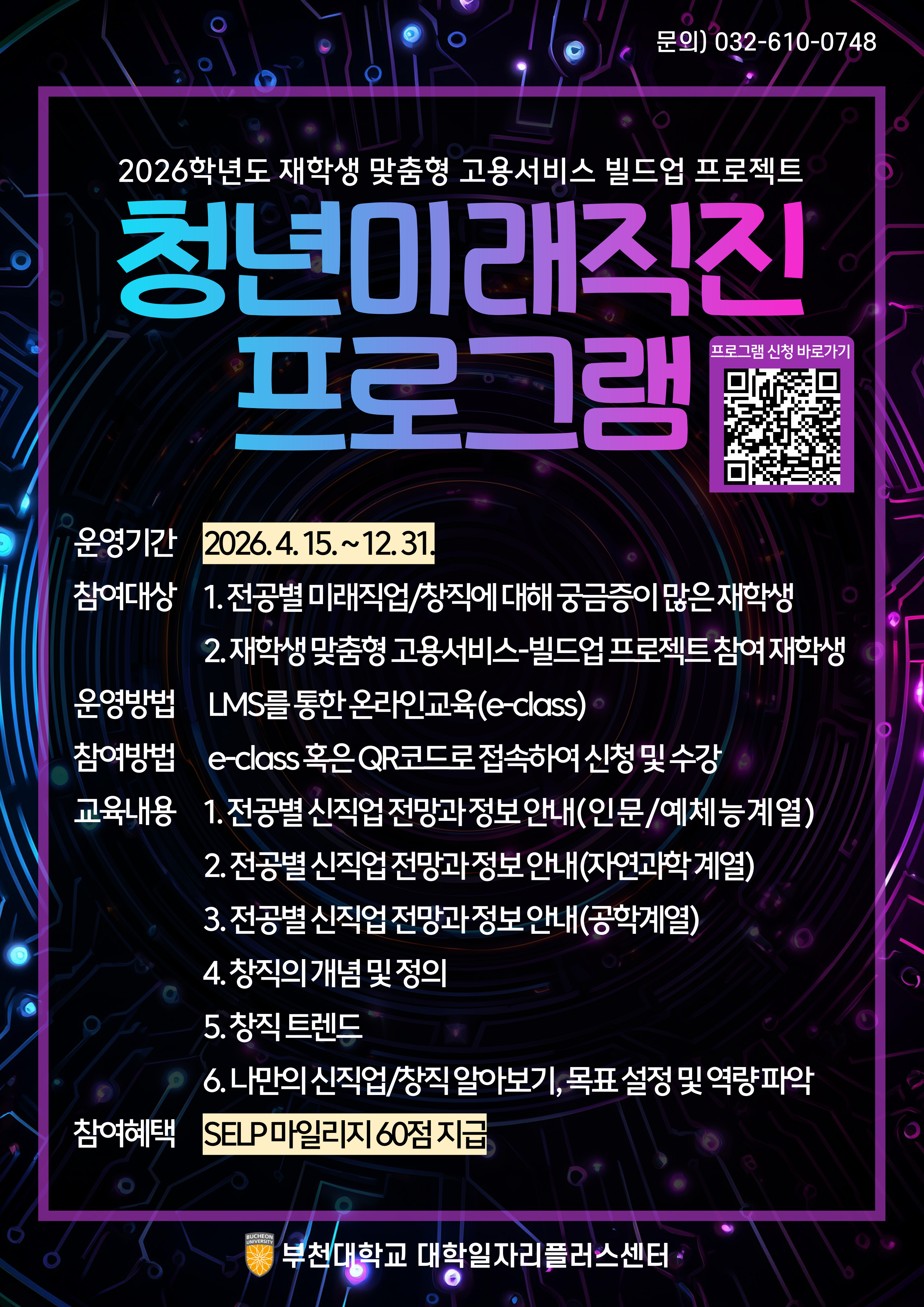 ★ 프로그램 신청 바로가기 : 2026학년도 청년미래직진 프로그램 청년미래직진 프로그램은 부천대학교 대학일자리플러스센터에서 제공하는 재학생 맞춤형 고용서비스 사업의 빌드업 프로젝트 참여자를 위한 프로그램입니다. 우리대학 전공별 맞춤 정보를 기반으로 한 미래 진로목표 설정 방법을 제공합니다.