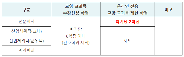 ※ 온라인 전용 교양 교과목 학기당 2학점 이내
